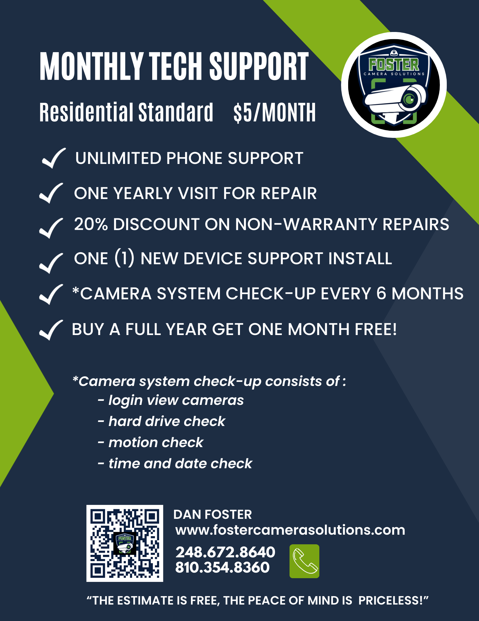We install state-of-the-art security cameras for all of your needs. We offer multi video security systems at a price you can afford. Our systems can be viewed on-site or remotely from anywhere! Wired System – No hacking! No Monthly Fee – Once it’s installed, you own it, you monitor it! Battery Backup – In case of power cut or power outage. Monitor with cell phone, tablet, laptop, home computer, home television. Monitor from inside your home, your back yard or 3000 miles away. Our Estimates are FREE, the peace of mind is PRICELESS!
